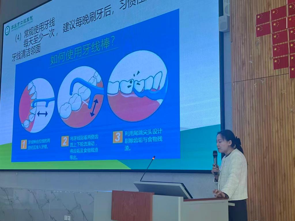 活动现场,沈主任和谢主任借助PPT与临床案例,将专业知识通俗化。讲解口腔常见疾病时,用真实病例图片展示龋齿、牙周炎等危害;介绍预防保健知识时,现场示范巴氏刷牙法,强调刷牙要点,还演示牙缝刷使用技巧。针对“洗牙伤牙”“美白牙膏速白”等误区,通过科学实验和案例澄清,指出定期洗牙有益,美白牙膏效果有限,美白应咨询专业医生。