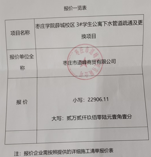 一、项目名称:枣庄学院薛城校3#学生公寓下水管道疏通及更换项目